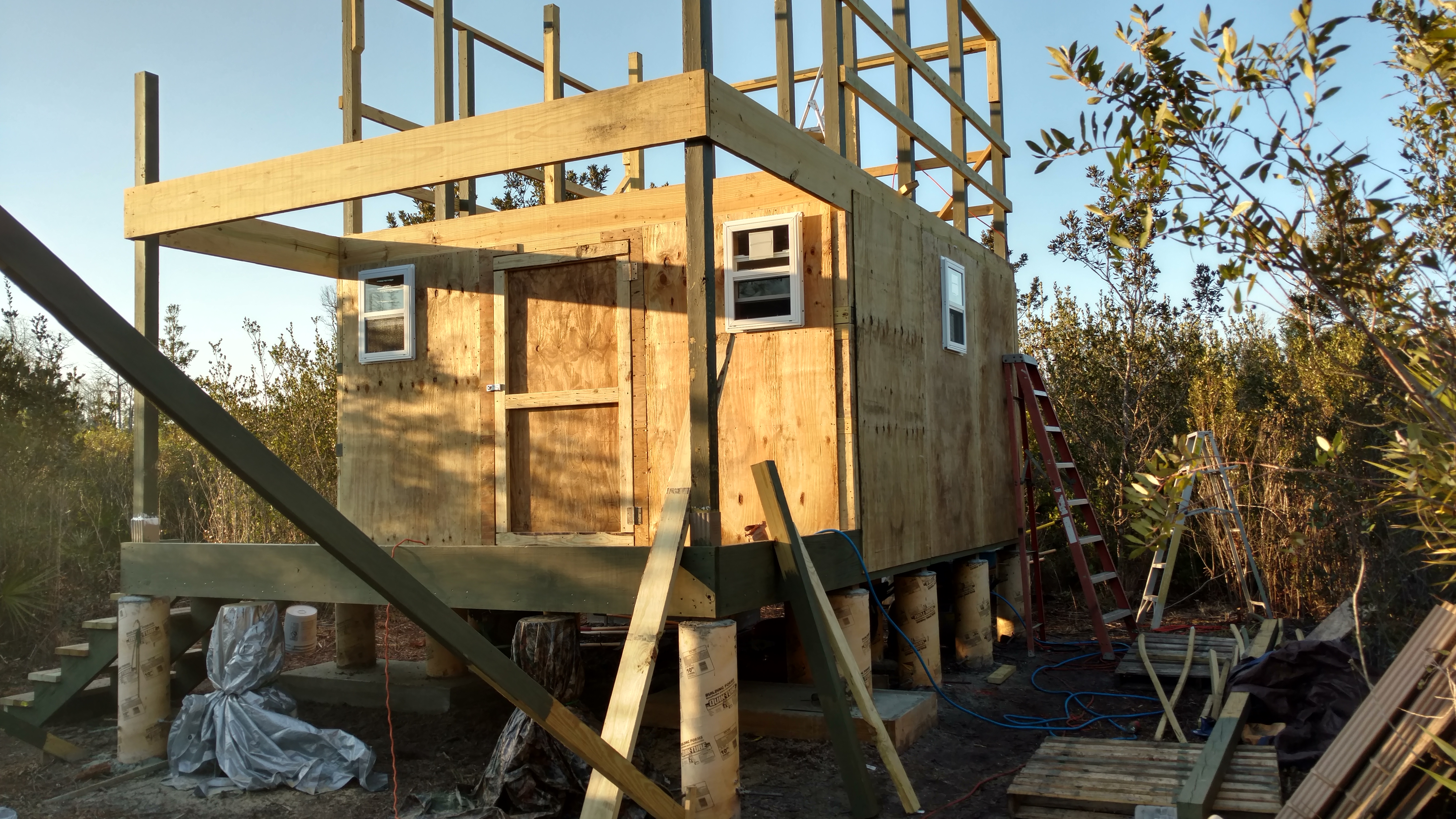 floor walls up, windows in and started framing the roof. I have to admit to having an irrational fear of heights so I was very uncomfortable working hanging off the side of the building by one hand while nailing on plywood. There are still areas that need to be nailed and screwed down but that will be done from an extension ladder. Randy had other pursuits so we wrapped up Wednesday then headed back to town. I spent Thursday sleeping, crawling through my storage and buying material. Friday morning I headed back out with a truck load of supplies and 60 pounds of ice to spend several days.