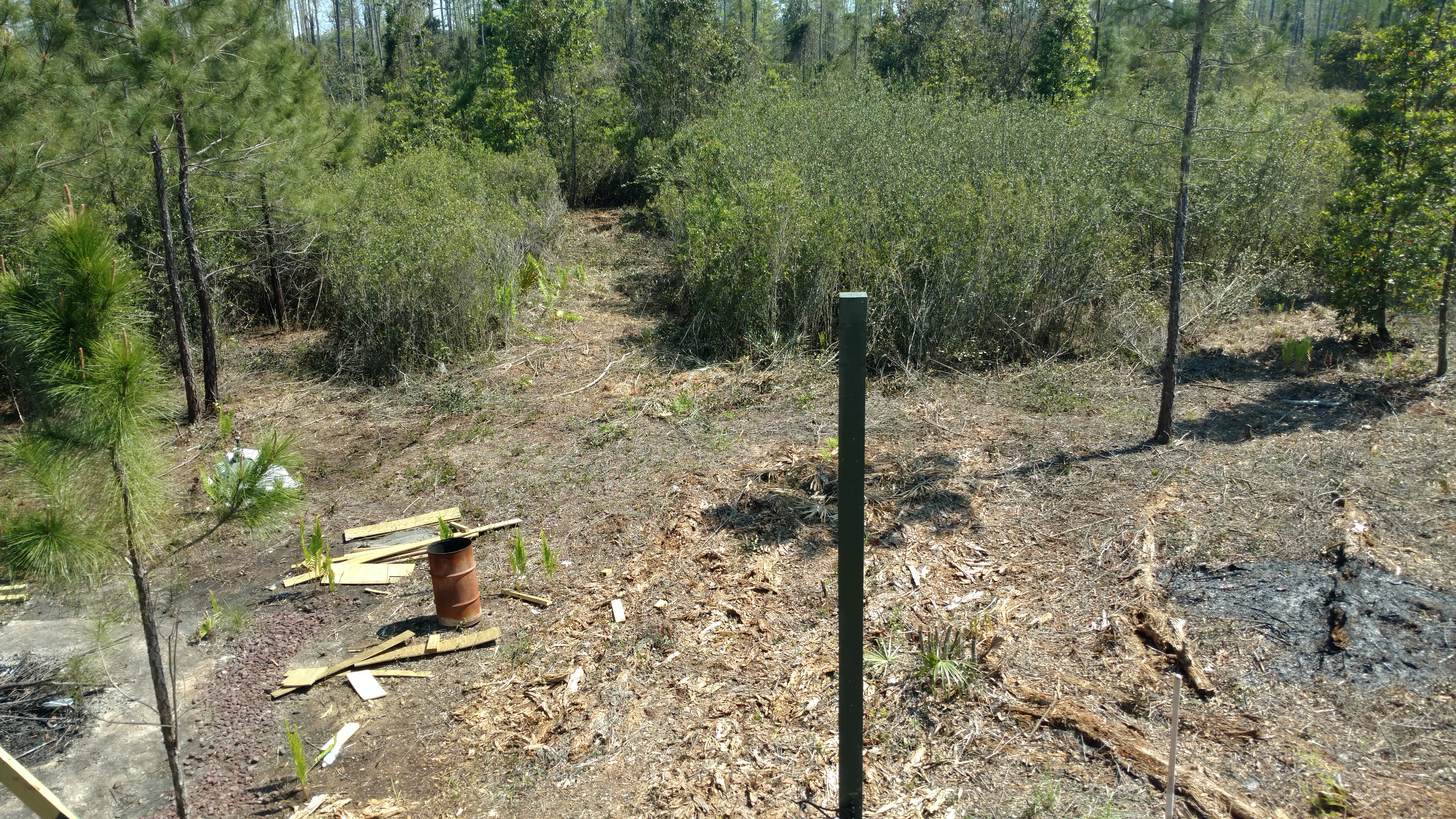 Here are some views of the place from the road. That’s the second floor you can see. I believe once I get it skinned and painted that it’s going to be very hard to notice. I have bamboo planted between it and the parking area which will further help shield it from curious eyes. The bamboo I’ve planted is several species and grows anywhere from 25 feet to about 70. I’m also planning on putting some tree limbs off the side with Spanish Moss to hide it even more. The parking area will be blocked off and planted soon. I’ll put another gate behind some foliage back where the pine tree is just in case I need it. All the brush along the road will eventually be cleared and replaced with blackberries, trifoliate orange and any other nasty plant I can find. I want it very evident that if I don’t know you or you weren’t invited that pulling up to the drive, getting out with hands in plain sight and shouting “Hello” until I respond is the wisest course of action. There have been shootings out here over the years and I don’t intend to become the victim of some hot headed road hunter.